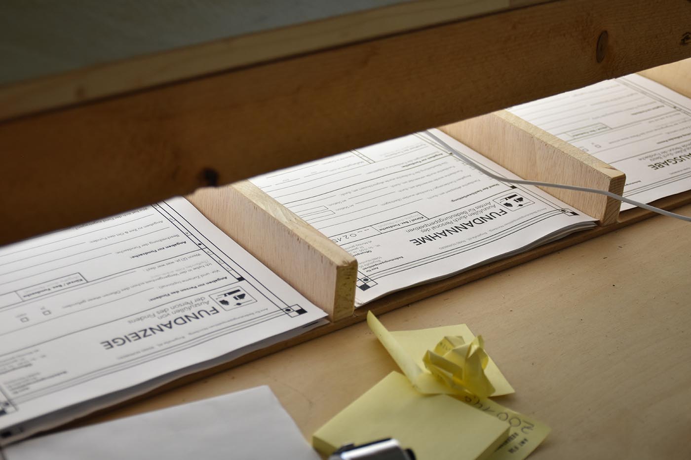 Für die Jahresausstellung 2024 haben wir das Amt für Bedeutungsperspektiven eröffnet, welches sich als ergänzende Einrichtung im akademischen Kontext versteht. Wir sammeln hier auf dem Campus gefundene Objekte, kategorisieren und bearbeiten diese und testen sie auf ihr narratives Potenzial. Das Amt für Bedeutungsperspektiven macht Angaben, Ausnahmen, Annahmen und Ausgaben, alles bleibt jedoch Ermessensspielraum des Personals, vergleichsweise zu einer willkürlichen Bürokratie. Während der Jahresausstellung 2024 konnten Besucher:innen das Amt besuchen und nutzen. Wir haben während der Zeit an verschiedenen Stationen gearbeitet, uns um die Fundobjekte gekümmert und besondere Objekte, sowie Ergebnisse der Stationen in einer wechselnden Ausstellung kuratiert.