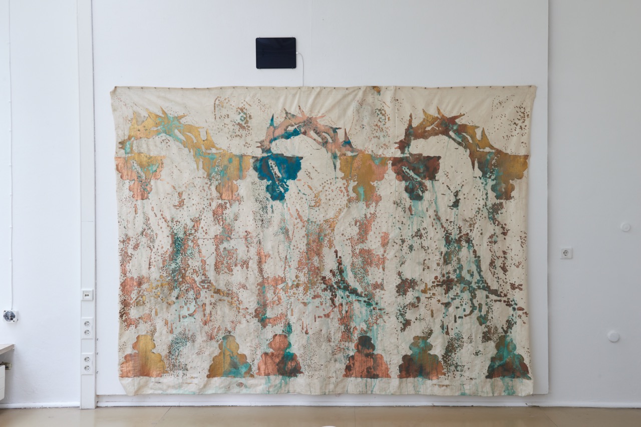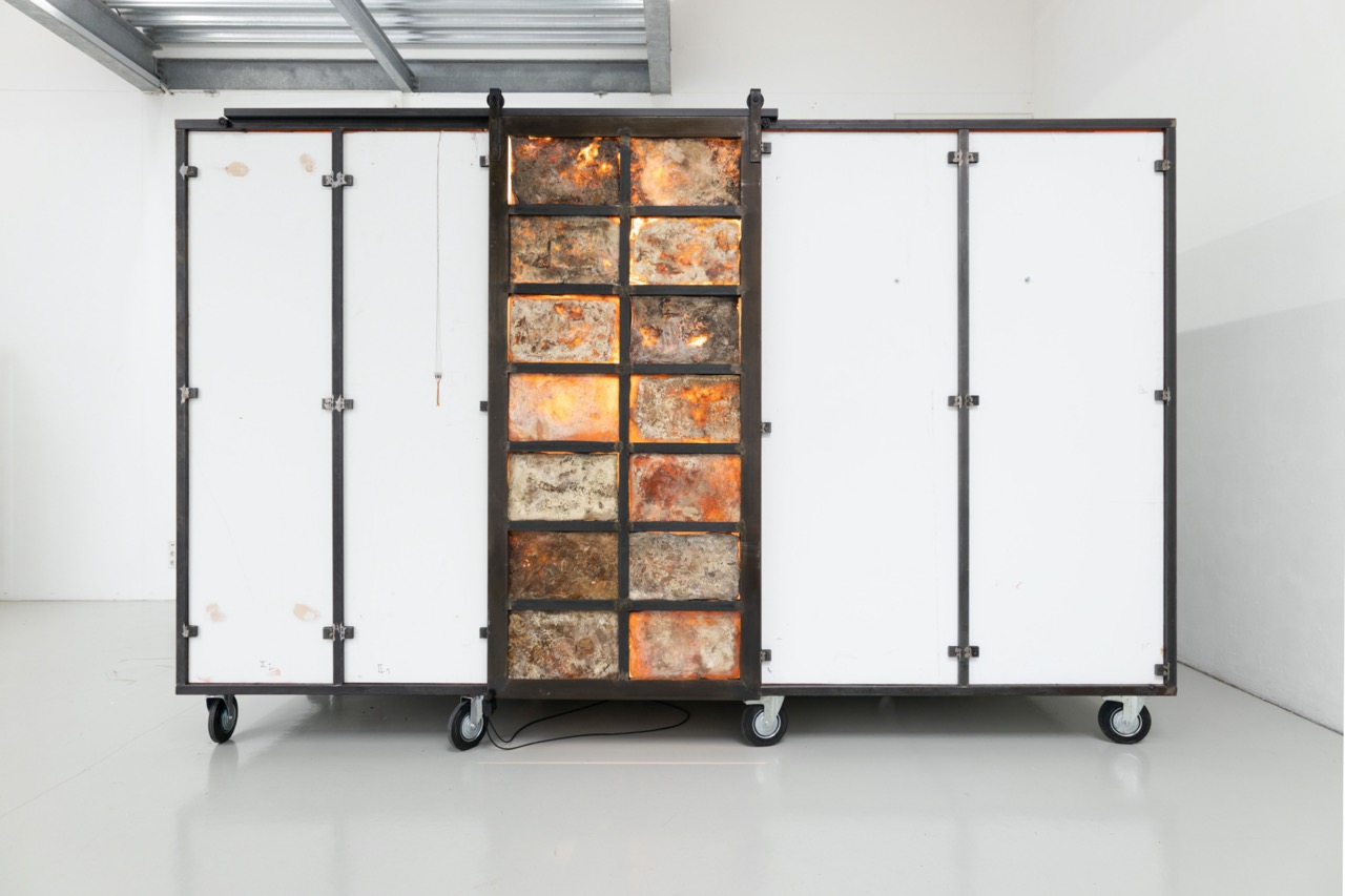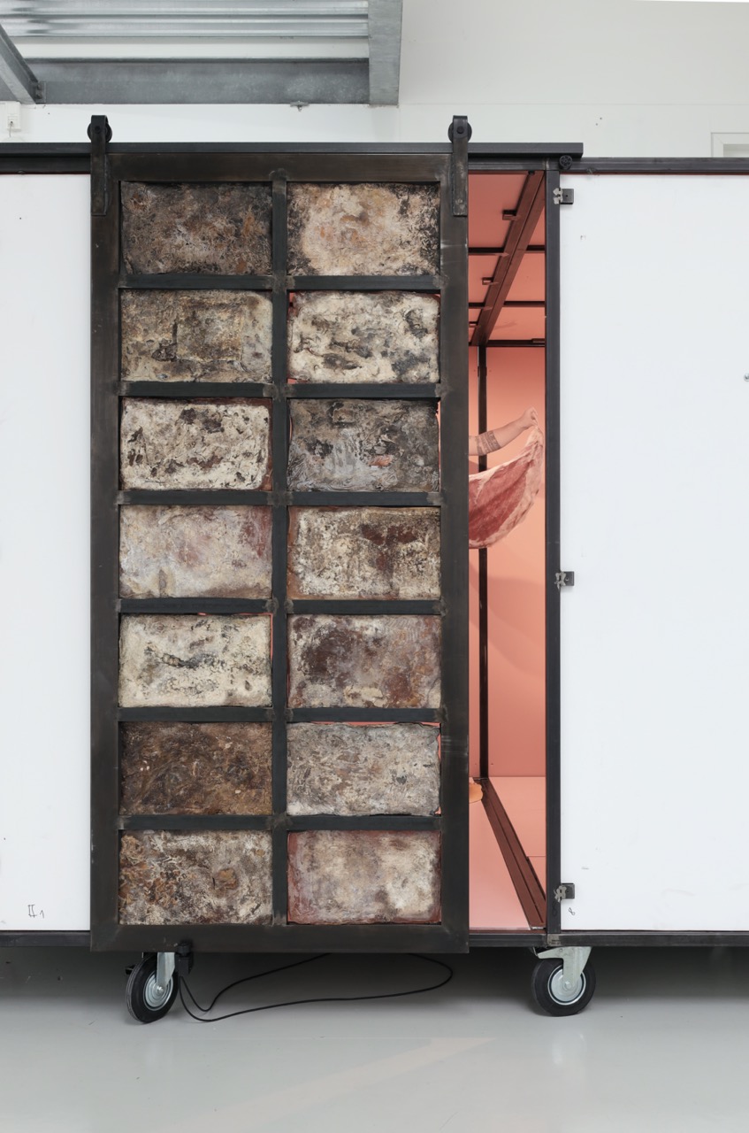 1 "Ворота к тысячам орушиx свиней - Das Tor der 1000 kreischenden Schweine", 2020/21geschweißter Stahl, Gelatineplatten, Fixierschaum, 108 x 228 cm