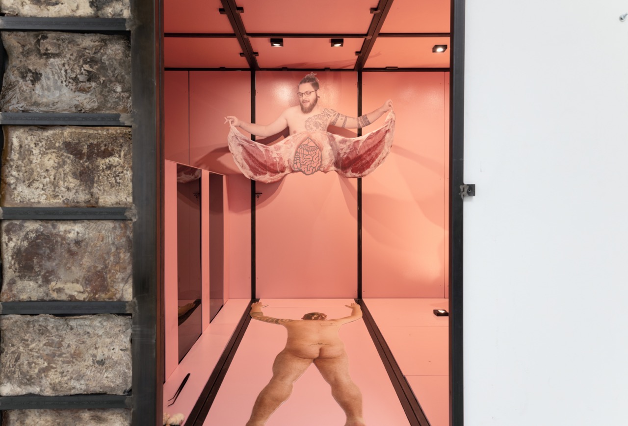 2 "Feed me!", 2019Digitale Collage auf PVC-Plane, geschweißter Stahlrahmen, OSB, Schaumstoffrohr, gefüttert" mit Wolle, 90 x 160 x 15 cm