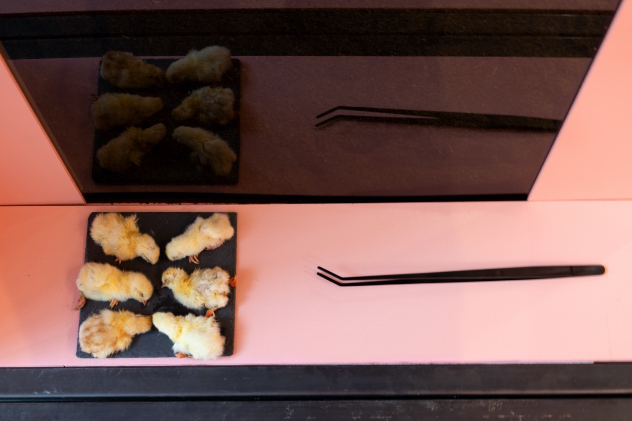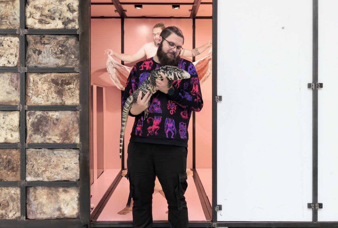 3 "Feed me, too!", 2021Schwarz-weißer argentinischer Teju, Kokoserde, Plastikkakteen, Pflanzsteine, UVA und UVB Terrarienlampen, Trinkschale, Schieferplatte, Futter-Küken, Pinzette, Raspberry Pi, Ultraschallsensoren, Lautsprecher, Sprecher Johannes-Paul Hanisch, 270 × 100 cm