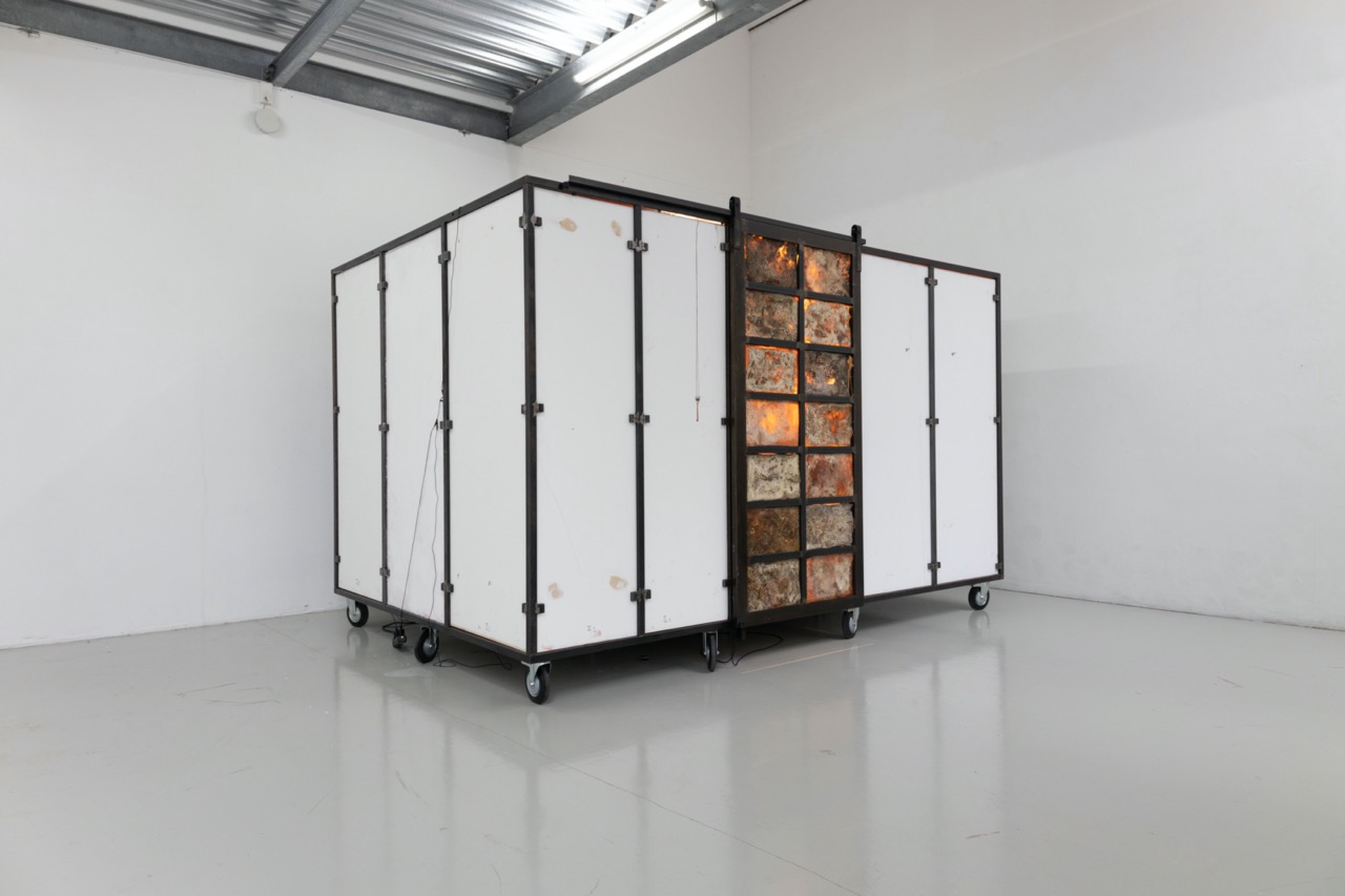 "modulare Koje", geschweißter Stahlraum auf Rädern, Tischlerplatten, Truhenschalter, Beleuchtung