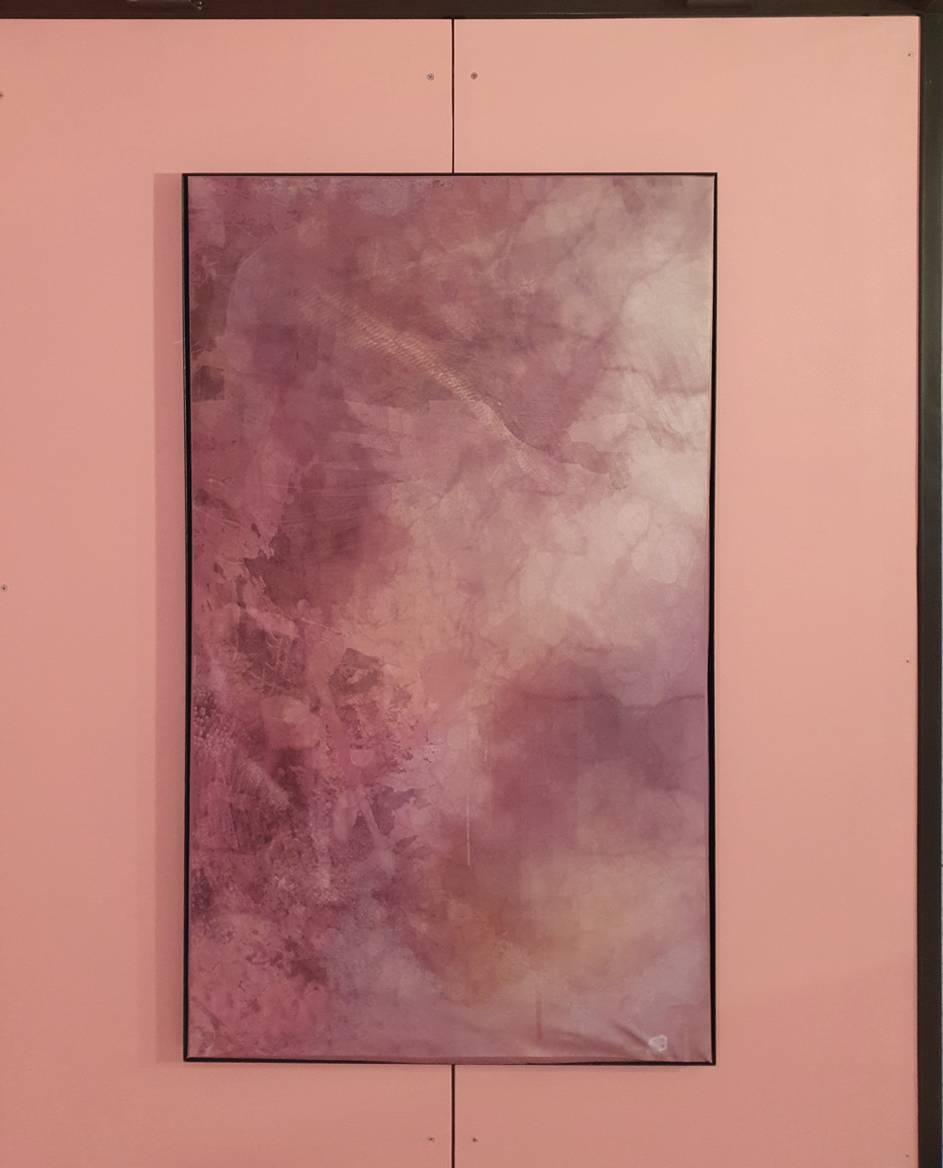 4 "Nantaimori - ein rosig, schmackhafter, doch haariger Schutzpatron", 2020/21Digitaldruck auf PVC, Aluminiumplatte, Pannesamt, Silikon, pakistanisches Rosenöl, 172,6 x 96,3 cm
